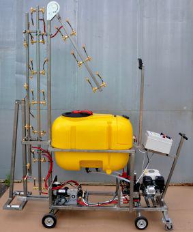 Wózek do oprysków OP-L przeznaczony jest do wykonywania oprysków w szklarniach w systemie, gdzie pompa i zbiornik znajdują się na łączniku, a wózek ciągnie się między rzędami roślin.